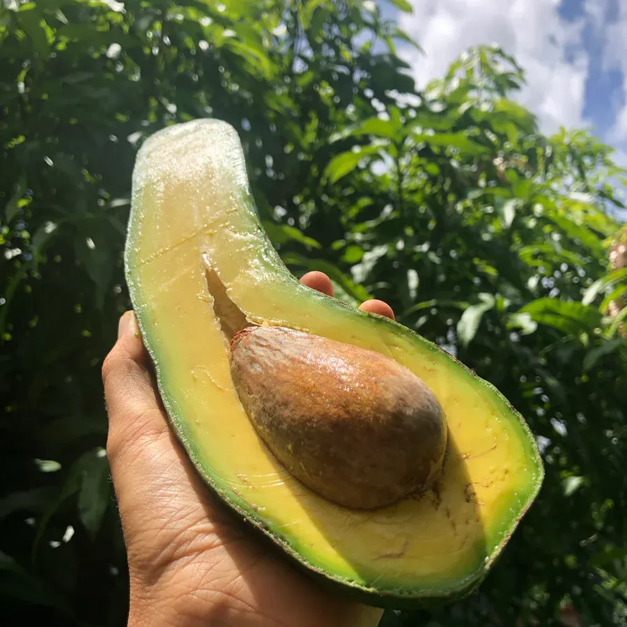 Flavor Profile: Long neck avocados have a long neck giving it a total length up to 13 in (32.5 cm); The skin is smooth, glossy, and thin. The flesh is thick and creamy. Flavor is savory and slightly salty. The seed is relatively small compared to size of the fruit and viable. The flesh is soft yet pliable, high in moisture content with a melting quality. The fruit has a large central pit, yet because of the fruit's size (often weighing over a pound) edible yield is still high.