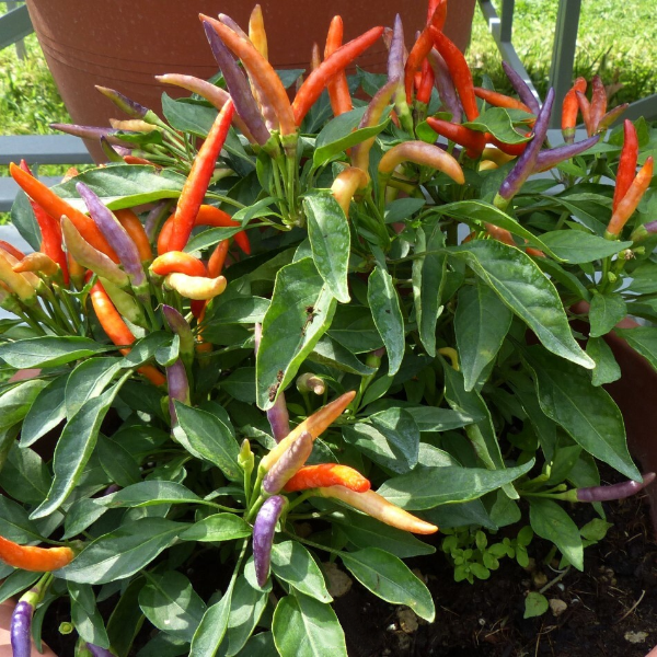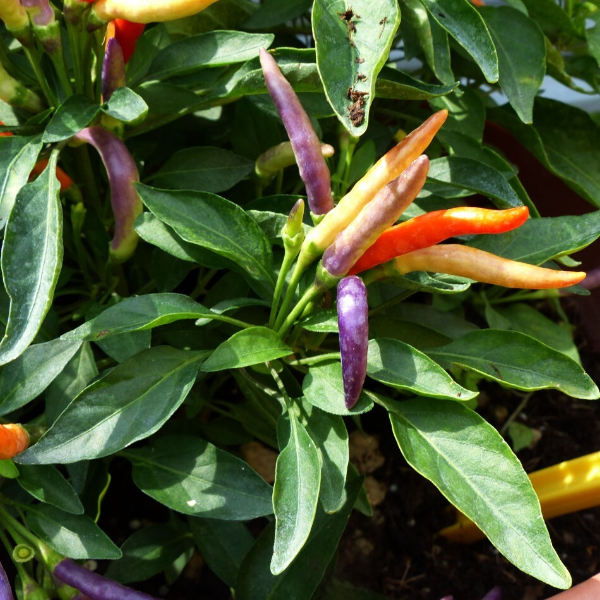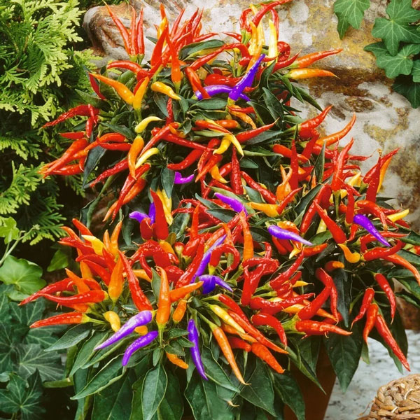 These beautiful peppers have hot flavor. Peppers grow in yellow to purple to orange to red. A prefect variety for containers and raised beds. Easy to grow. Looks really beautiful as the peppers begin to mature.